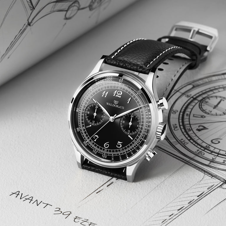 The Avant 39 Eze features a striking black dial that artfully combines functionality with elegance. It boasts two well-integrated sub-dials for its chronograph function, set against a backdrop of applied arabic numerals and sleek markers for a clean, readable display. The inclusion of a tachymeter scale underscores its practical heritage with a nod to classic racing chronographs.