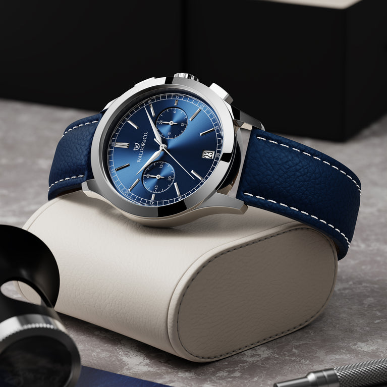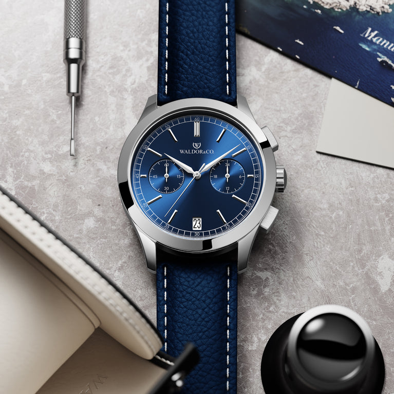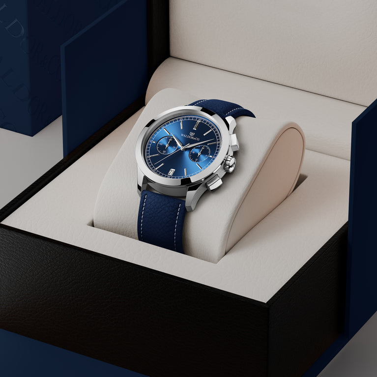 A round mens watch in rhodium-plated silver from Waldor & Co. with blue sunray dial and genuine blue leather strap. A second hand. Seiko movement. The model is Chrono 39 Sardinia 39mm.