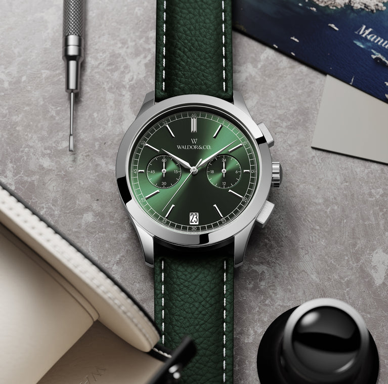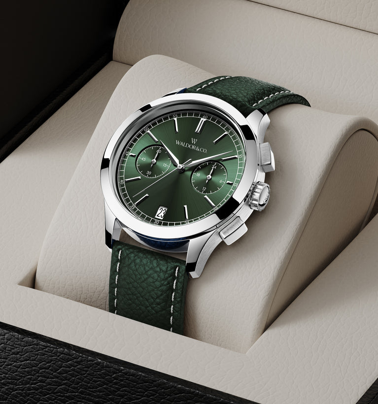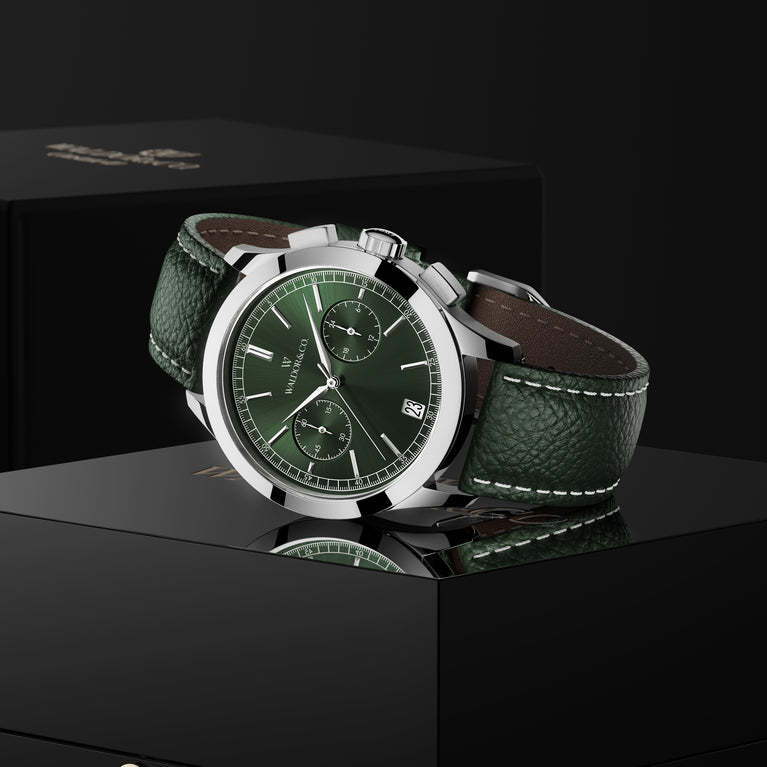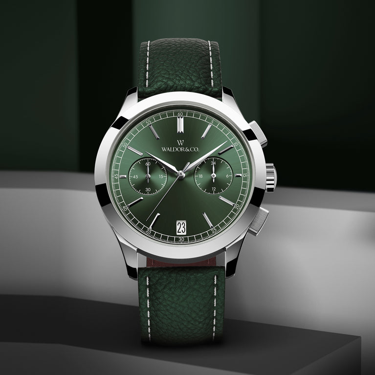 Strap: Genuine green leather, clasp in rhodium-plated stainless steel