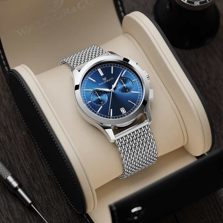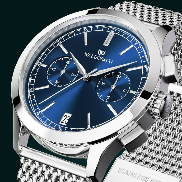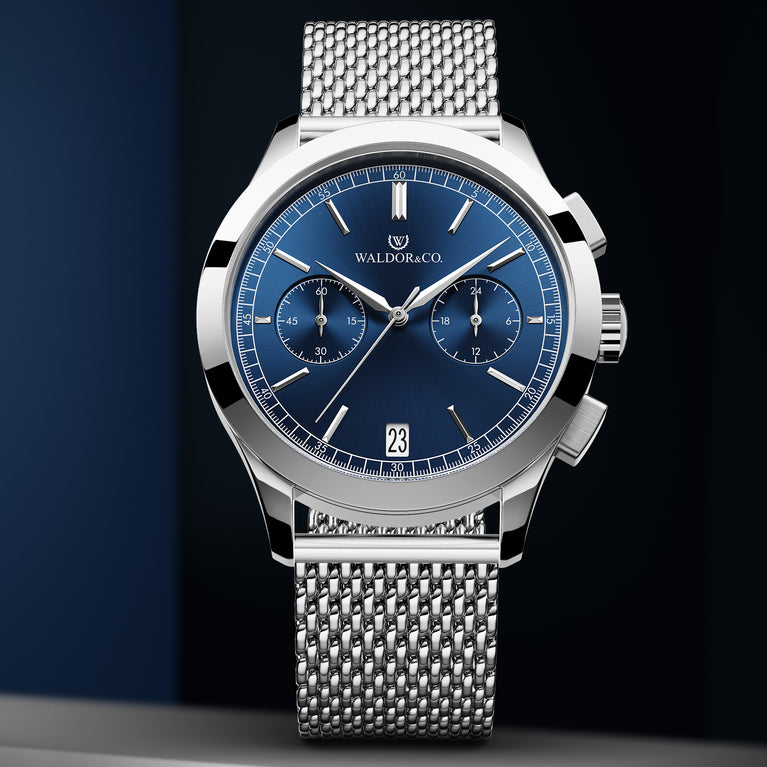 A round mens watch in rhodium-plated silver from Waldor & Co. with blue sunray dial and a second hand. Seiko movement. The model is Chrono 44 Sardinia 44mm.