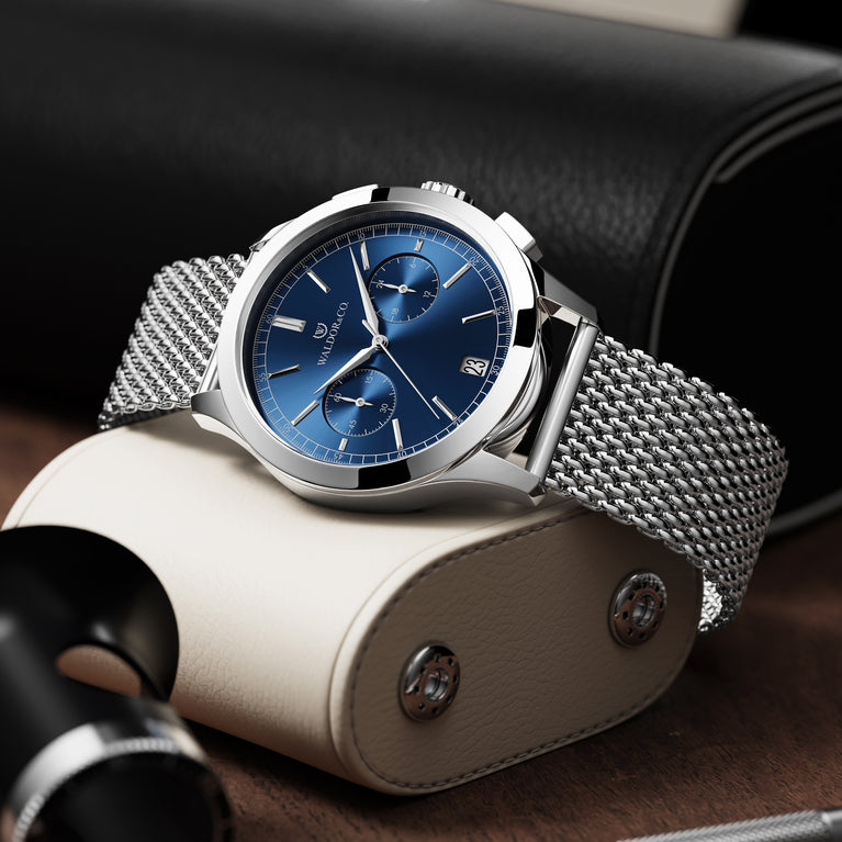 The Chrono 44 Sardinia merges style and substance with its sleek 44mm case and vibrant blue brass dial. Its polished stainless steel indices and hands add a lustrous touch, set under sapphire crystal for enduring clarity.