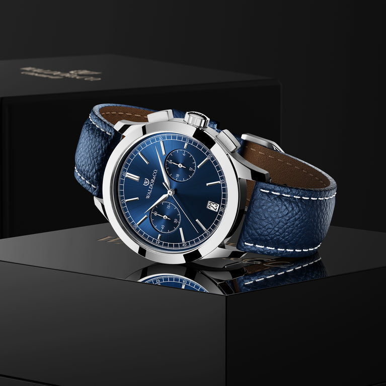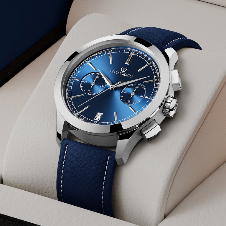 A round mens watch in rhodium-plated silver from Waldor & Co. with blue sunray dial and genuine blue leather strap. A second hand. Seiko movement. The model is Chrono 44 Sardinia 44mm.