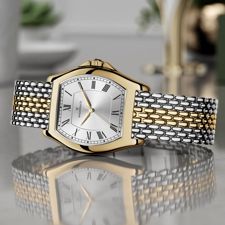 A square womens watch in 22k two-toned silver and gold plated 316L stainless steel from Waldor & Co. with domed mineral glass dial. Seiko movement. The model is Constant 36 Menaggio.