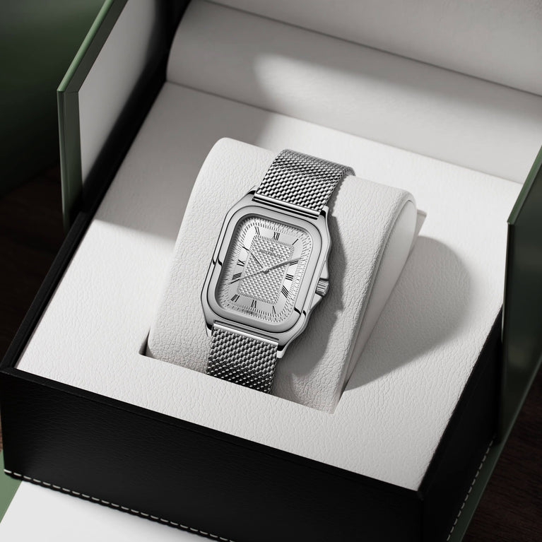Dial material: Silver patterned dial in brass with silver details